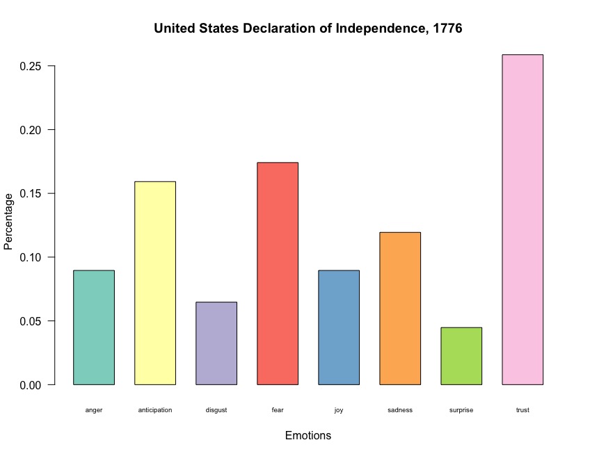 We see below that over a quarter of the words used in the US Declaration of Independence fall into the Trust emotional category, followed by Fear, Anticipation, and Sadness.
